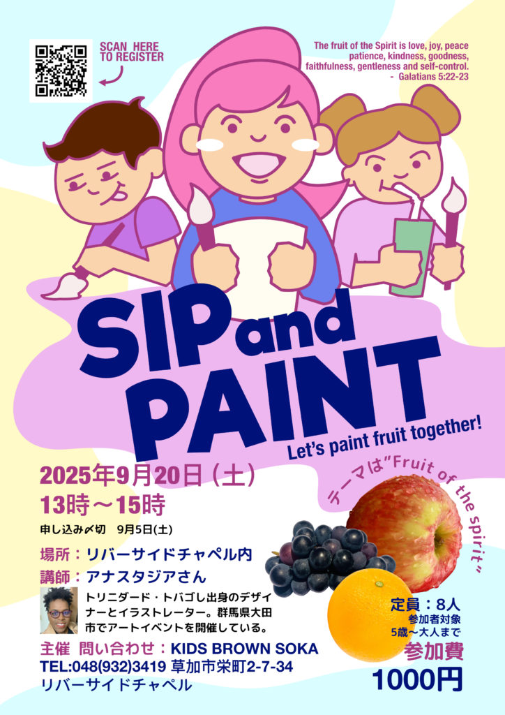 さて、本日は当教室主催のイベントのお知らせです。9月に開催するイベントは”Sip and Paint”です。Sip とは「飲み物を少しずつ飲む」という意味です。お茶をしながら絵を描くイベントとなっています。講師にはデザイナーをされている方をお招きしています。小さい子ども~大人の方までそれぞれのペースで、お茶をしながら絵を描いていきましょう。当教室の日本人スタッフもおりますので、「英語にチャレンジしたいけど心配」「子どもの集中力が持つかしら…」という方も安心してお越しください。
