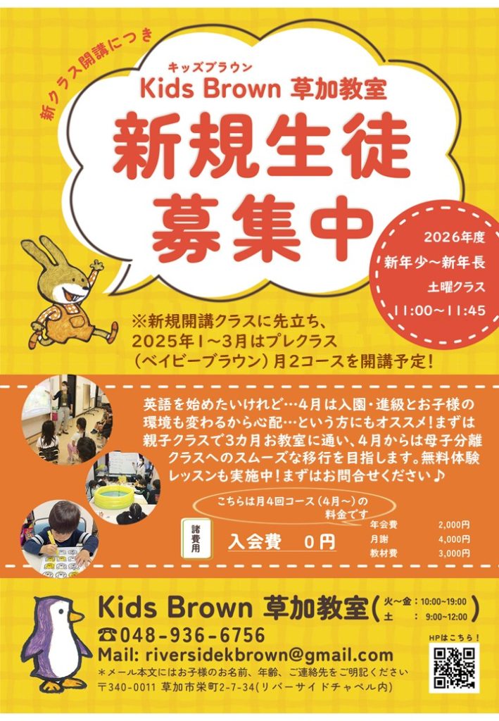 2025年1~3月は親子クラスから始まり、4月~は母子分離クラスへと移行します。無料体験レッスンも随時開催中です。ご興味のある方、ご質問のある方はお気軽に電話やメールでお問合せください。