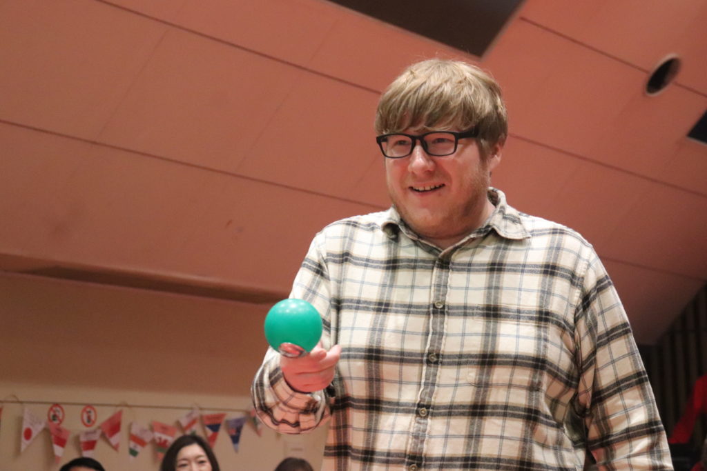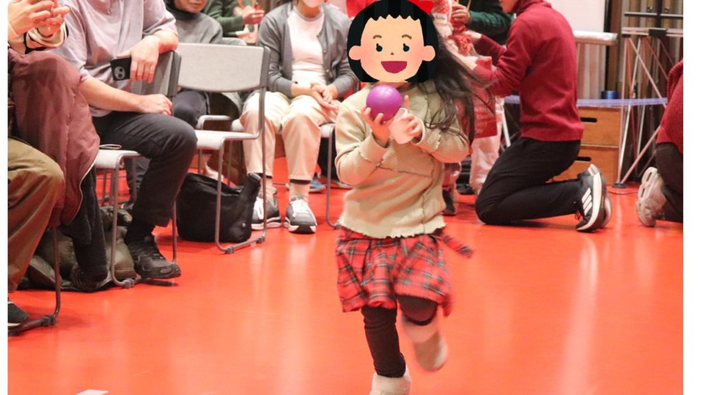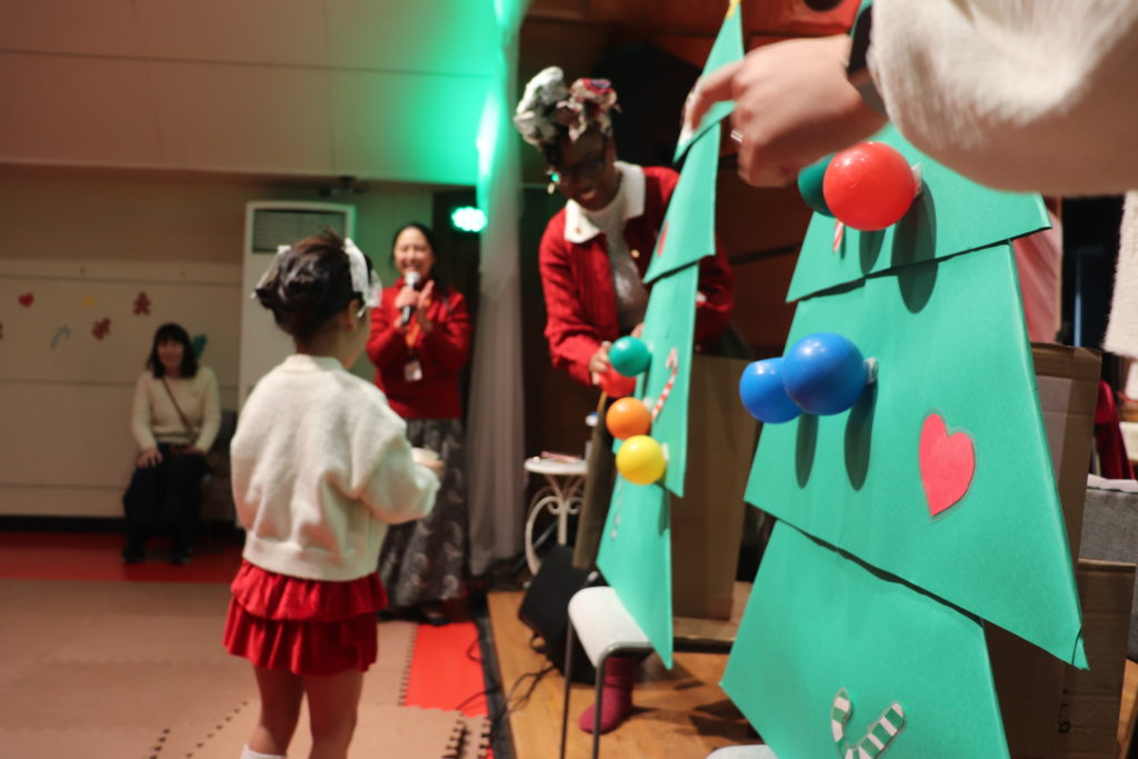 さて、12月20日にはクラス合同のクリスマス発表会がありましたので、数回に渡ってレポートしていきたいと思います☆まずはゲームからスタート🎵今回は「クリスマスリレー」を皆で楽しみました。ちょっと寂しいクリスマスツリーを皆でデコレーションしました。小さい子は紙コップ、小学生以上はスプーンにボールをのせて、カラーボールをツリーまで運びました。保護者の方やジョシュ先生にもお手伝い頂いて、素敵なクリスマスツリーが完成しましたよ☆