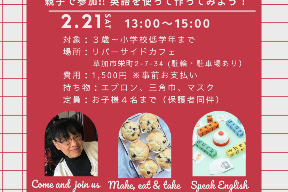 (タイトルをクリックすると、チラシ全体を見ることができます。) Happy Valentine!!! 当教室に通われていないお子様も参加でいるイベントのご案内です。 2年前の夏休みに好評だった英語deお菓子作り企画♡久しぶりの登場です。 英語の先生Remy先生と一緒にマフィンとクッキーを一緒に作りませんか? 焼きあがる時間には英語のゲームもします♪ 日本人スタッフもいるので英語初心者のお子様、パパママも安心してご参加できる内容となっています。 2月21日(土)13時~です☆ *こちらは親子でご参加頂くイベントです。 *対象年齢は3歳~小学校低学年 参加費、申し込み方法などはチラシをご覧ください。先着順となりますので、ぜひご興味ある方はお早めにお問合せください。皆さまのご参加をお待ちしています♪