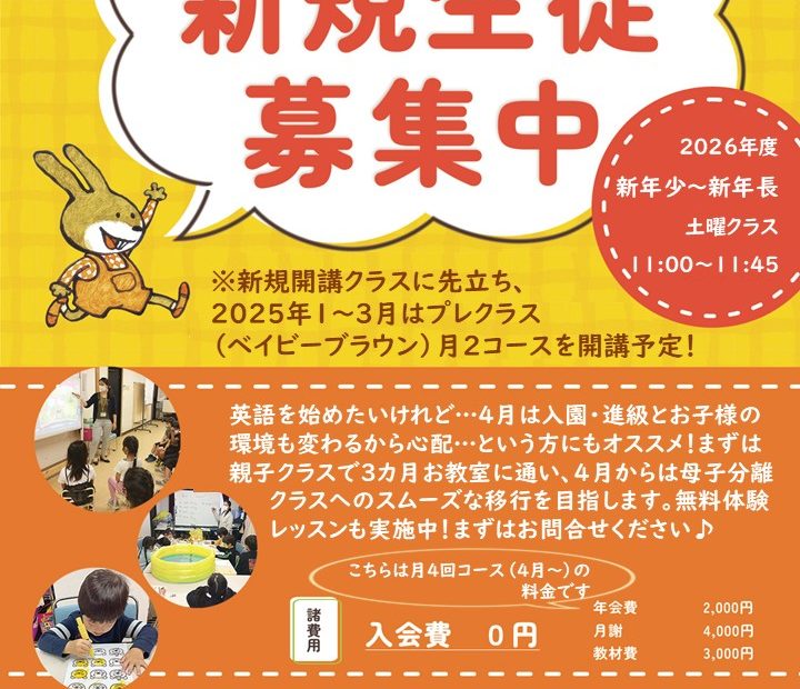 (タイトルをクリックすると、チラシ全体を見ることができます。) 寒波襲来により、より一層寒い今日この頃、皆さまいかがお過ごしでしょうか。 さて、先週からBaby Brown(親子クラス)がスタートしました。体験レッスンにお越し頂いた方、ご入会頂いた方、ありがとうございました。 レッスンに参加された保護者の方々からは「フォニックスがレッスンに取り込まれていて良かった。」「子どもを飽きさせない工夫が随所に見られた。」などなど、嬉しい感想を頂きました。 こちらのコースは月2回コースで、今後の予定は1/13, 2/14, 2/28, 3/21, 3/28 11:00~です。スケジュールが変更される場合もありますので、体験レッスンに参加ご希望の方は、一度お問合せください。 Let’s have fun together!